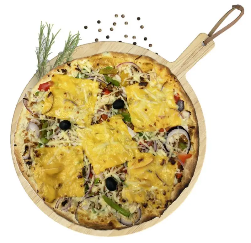 Sauce chicken, Poulet rôti, Poivrons 3 couleurs, Oignons rouges frais, Oignons frits, Cheddar, Fromage, Olives noires